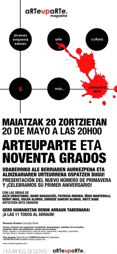 Hoy Jueves 20 de mayo, a las 20:00 h se presenta, coincidiendo con el primer aniversario, un nuevo número de la revista arteuparte, que dirige Paul Lataburu. Sera en un espacio muy apropiado para la ocasión, Noventa Grados. Además se podrán ver las obras de los artistas Gato Urbistondo, David Nascués, Patricia Inwoko, Iñigo Manterola, Beñat Maiz, Oscar Alonso, Enrique Sancho Alonso y Aritz Kabe. Y para el que quiera alargar la noche, a partir de las 23 h se continuara en el Arraun. Invitados estáis!!