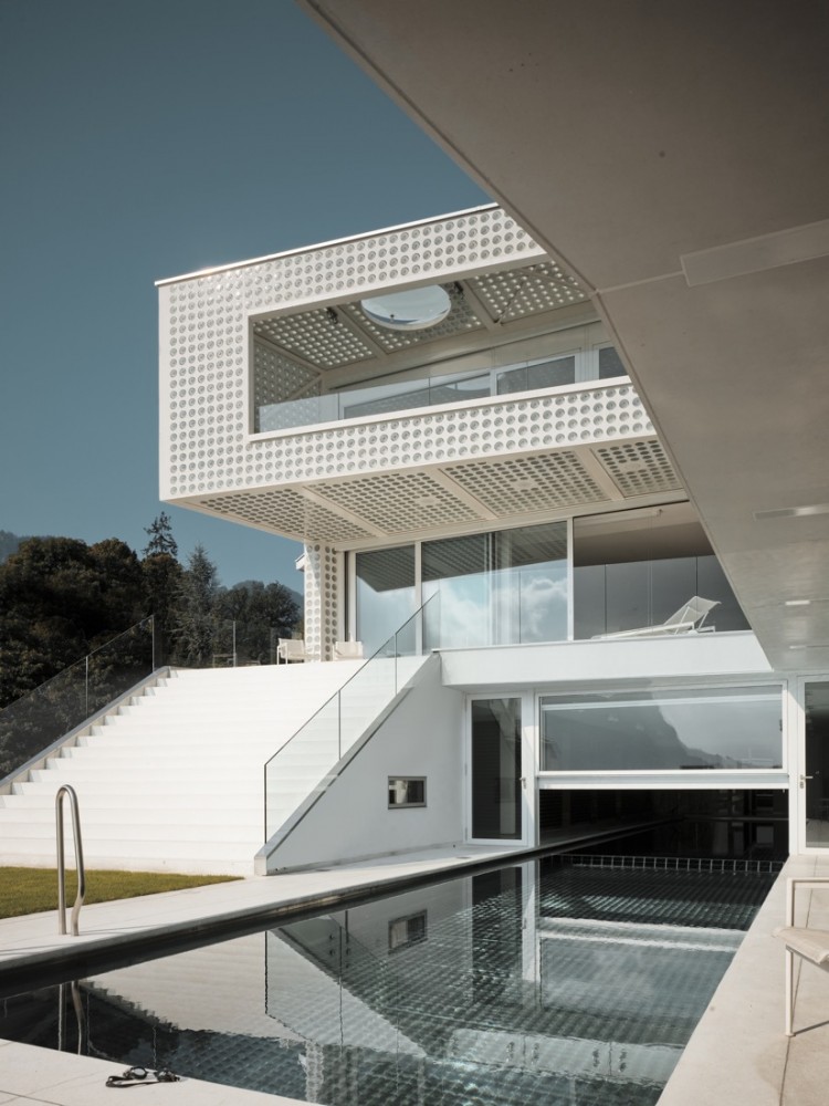 Esta vivienda se encuentra en Vierwaldstattersse, en Suiza, se finalizo en 2007 y el estudio de arquitectura que lo realizado es Stuebi Architekten Philippe y Eberhard Troger. Las fotografías pertenecen a Dominique Marc Wehrli. Se encuentra frente al lago de Lucerna y la montaña del Rigi y se ha pretendido realizar con cierto aspecto escultórico con grandes fachadas blancas con aperturas circulares, transmisoras de luz.