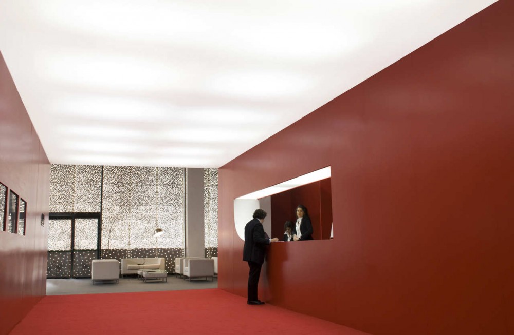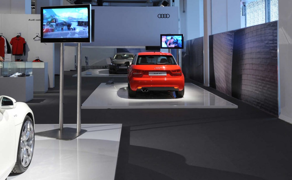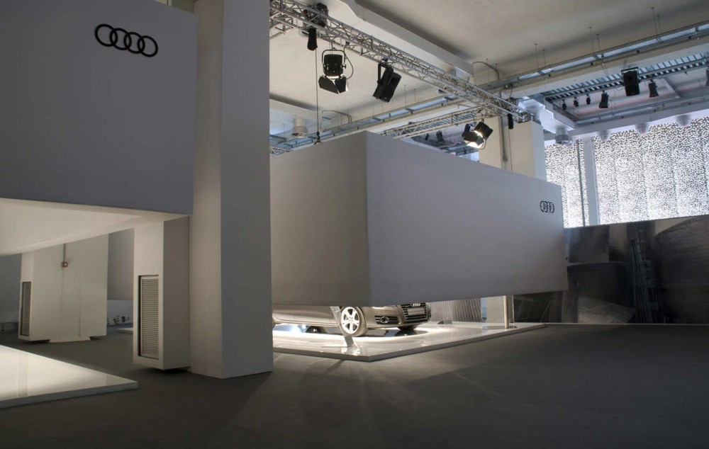 Este espacio Audi se encuentra en Milán, Italia y está realizado por los arquitectos Oficina UAU. Se ha realizado en 2010 y las fotografías son de Spa Eurostands. Una entrada totalmente roja da la bienvenida a los visitantes que una vez dentro se encuentran con un espacio expositivo en blancos y grises además de una zona de relax. Los coches se encuentran ocultos en una especie de “caja” que se cierra o se abre elevándose para poder ser vistos.