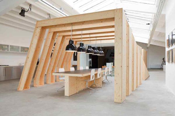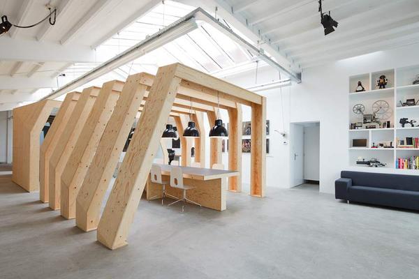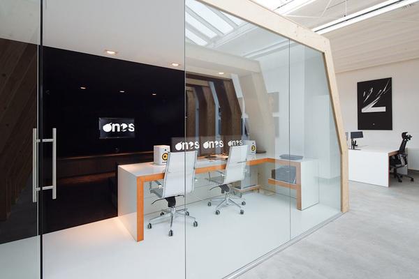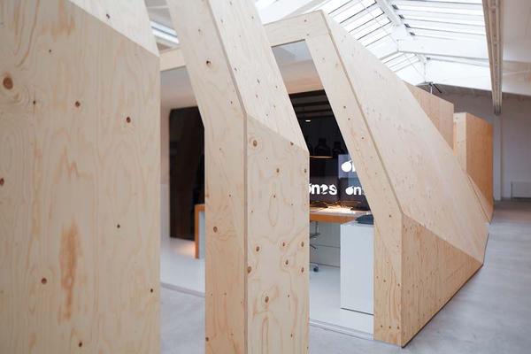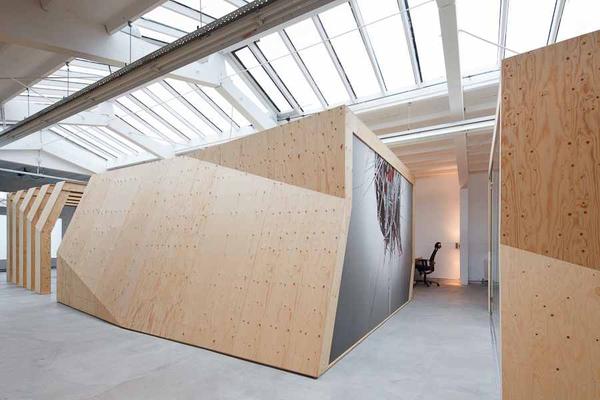 El proyecto que hoy presentamos son unas oficinas realizadas por Origins Architecture a las afueras de Amsterdam, para la empresa Onesize Las fotografías son de Stijn Stijl. Al adquirir este pabellón y acondicionarlo sin querer modificarlo, optaron por buscar un sistema de compartimentación interior independiente que no alterara el espacio original. Para ello se crean una serie de volúmenes alineados bajo la claraboya original, realizados en madera de abeto que crean las diversas estancias necesarias.