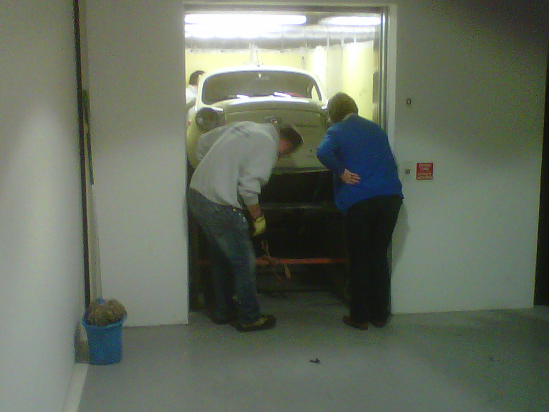 Se trata de la colocación de un Seat 600 en la exposición, en el claustro alto, un lugar de difícil acceso para este tipo de pieza.