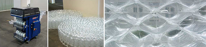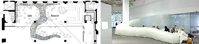 Os presentamos un elemento divisor realizado de forma temporal en la feria de Suiza en 2005 por el studio Zmik special. Las fotografías son de Christophe Bosset. Este pared realizada en un revestimiento plástico almohadillado sirve de elemento separador del un restaurante con una zona de paso y hall, dentro de un espacio de muestras. Realmente se trata de material de embalaje, que montado de forma superpuesta y con un trazado curvo, realizan la función de elemento divisor.