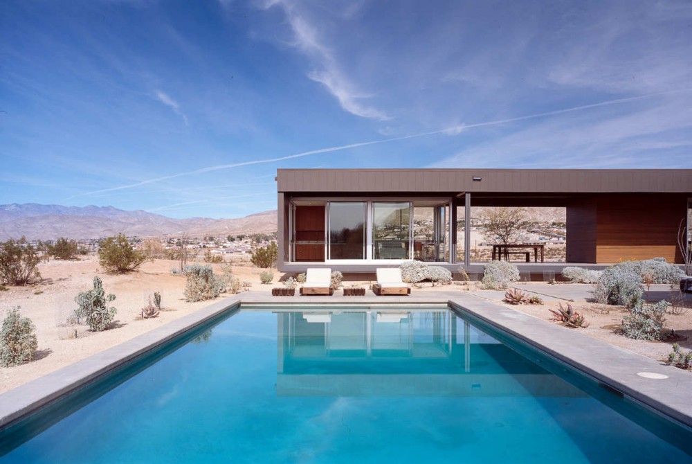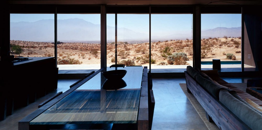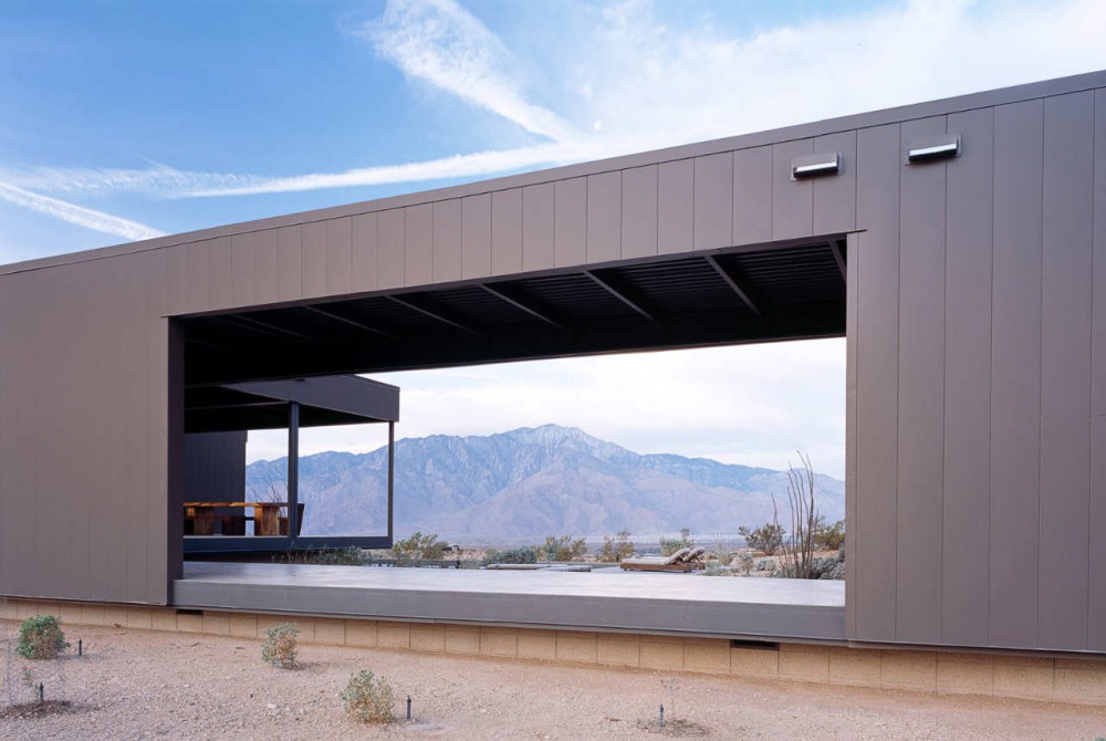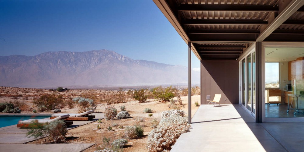 Esta casa en el desierto esta realizada en 2005 por el estudio Marmol Radziner, y se encuentra en Hot Springs, California. Las fotografías son de Joe Fletcher. La casa consta de 4 módulos que definen los espacios habitables y 6 módulos de cubiertas. Toda la construcción y las estancias invitan a una unión permanente de interior y exterior sin límites visuales. Los módulos son prefabricados con una estructura de acero y un ancho de 12 metros que permite montarlo y revestirlo de diversos materiales in situ.
