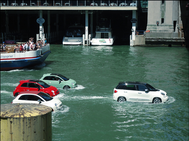 a ver una “flotilla” de vehículos Fiat trasformados en barco